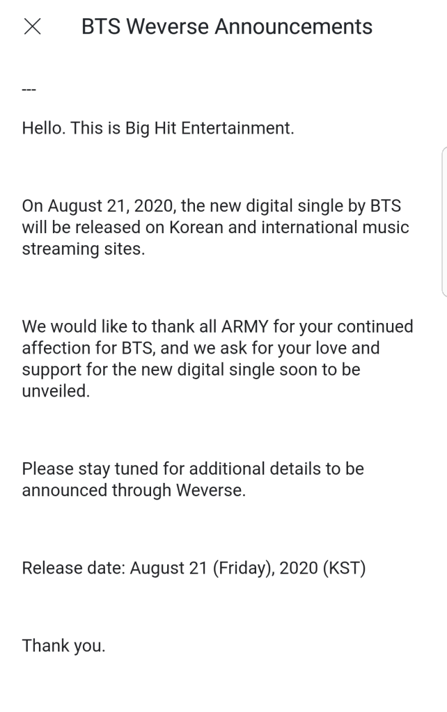 Now BTS have given us something great to look foward to next month. Big Hit Entertainment announced that BTS will be dropping a new single on 21st August, and it will be an English song! For me English or Korean or Japanese, BTS music touches my heart to my nerves. The excitement is incredible that the days could not go any faster!