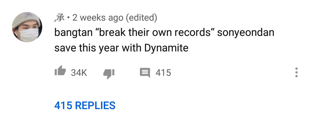 Last month we wrote about BTS’s top videos with 500K comments and above and DNA had the most comments with 6.2 million comments. As of right now, ‘Dynamite’ has beat that record and now has 6.5 million comments! Seems to me that ‘Dynamite’ keeps breaking BTS’s own records every waking minute!