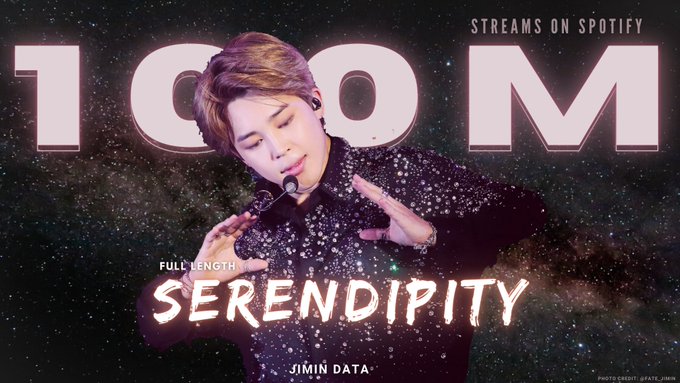 “Serendipity Full Length Edition was released on August 24, 2018 among the tracks out of BTS Album Love Yourself: Answer. Serendipity is a soulful song which talks about finding love in an expected way and yet it is destined to be. Fans trend #RecordMakerJimin and #SerendipityFull100M. The impact of Jimin’s serendipity is unstoppable and unmatched, the song got over 500 reaction videos in YouTube in 24 hours’ after its release. Dozens of rookies’ singers dancers covered it or showed their love and support for him, in conclusion Jimin is legend. The dance choreography of the song has also been covered by numerous idols and artists around the world. Serendipity becomes Jimin’s second song after “LIE” to reach 100 Million streams on Spotify. The song is the 4th BTS solo & 40th BTS song to cross 100M.