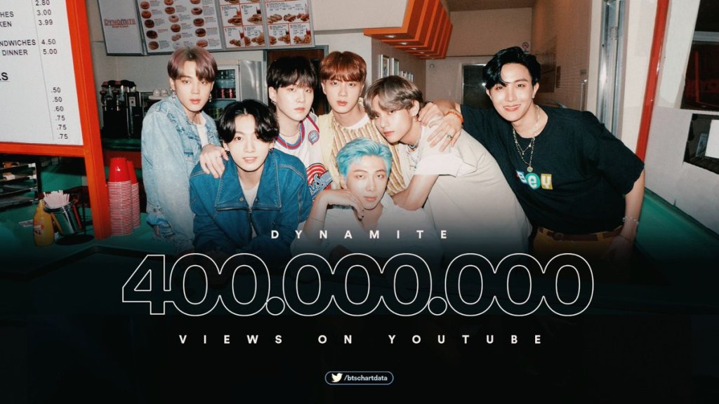 “Dynamite’ has officially surpassed 400 million views on YouTube. It becomes the fastest Asian act to achieve that milestone and 5th fastest of all time. ‘Dynamite was released on 21st August 2020. The BTS MV also broke records on YouTube with its release. The song’s music video amassed a record 101.1 million views in the first 24 hours of its release, according to YouTube. This is the most views for a music video in its first 24 hours!