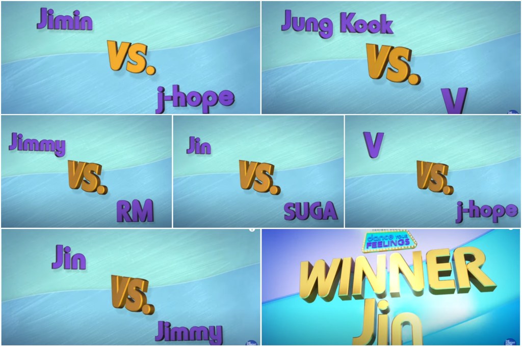 Round 1 Jungkook vs. V, they were to show joyful moves and V won