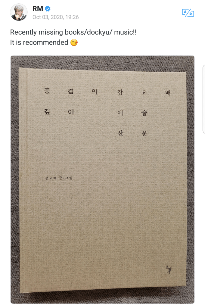 Today RM posted a few recommendations for ARMY on their Weverse App; a book, a documentary and music he is listening to. I’m happy to say that I watched the documentary a few weeks ago and it is totally thought provoking to say the least. Its no surprise that RM would recommend it knowing how indepth and detailed the documentary is. The book is by a Korean author, and is in Korean, making some people to search for the English version.