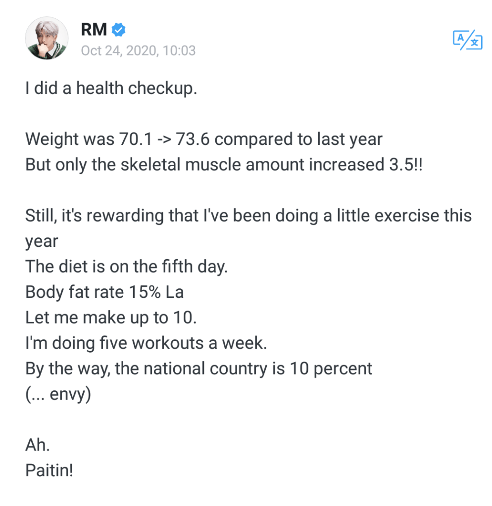 He shared that he has been doing a bit of work out. On his birthday VLive, he had shared that for several years he had not been able to work out because he had injured his shoulder a while back during one of their gym sessions. In September 2020, BTS leader Kim Namjoon, better known to fans as RM, gave ARMY an unexpected yet deeply appreciated glimpse into his personal health journey. Known for his introspective thoughts and poetic lyrics, RM isn’t usually one to boast about physical stats or show off gym progress. But during one casual update on Weverse, he surprised fans by revealing his health check results, complete with details about his weight gain, muscle mass percentage, and body fat levels.