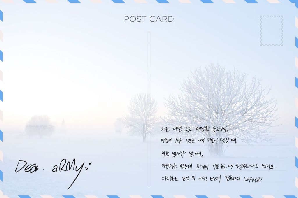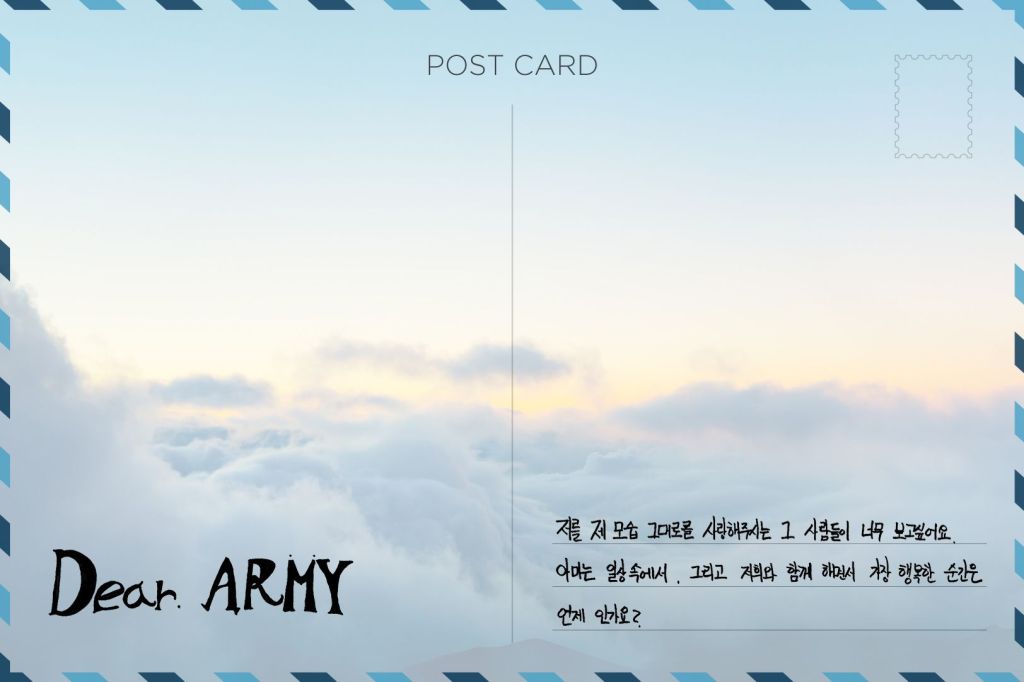 On Weverse, postcards from members V, Jimin, and RM were shared along with the message: “ARMY, please send your reply to BTS members with the hashtag #TO_BTS on Twitter!”