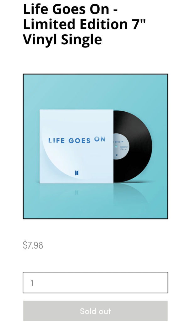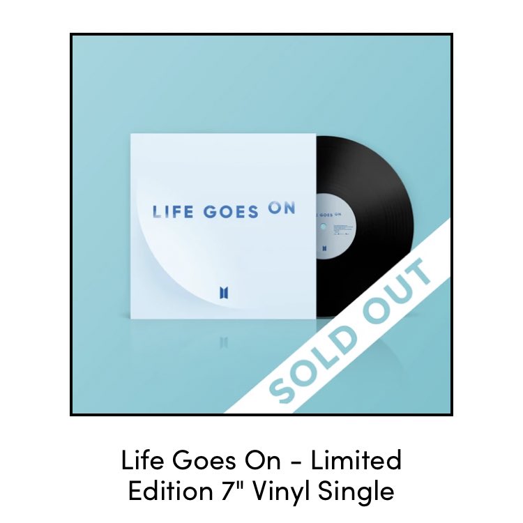 Just a day after its release, BTS preorder “Life Goes On Limited Edition 7” Vinyl Single has already sold out! I’m sure it probably sold out within hours of its release! The demand right now for BTS is on an all time high as ARMY gears towards the 20th November comeback. If this is a sign of what is to come then expect the comeback to be even more explosive than what “Dynamite” has been so far! The power that is ARMY!