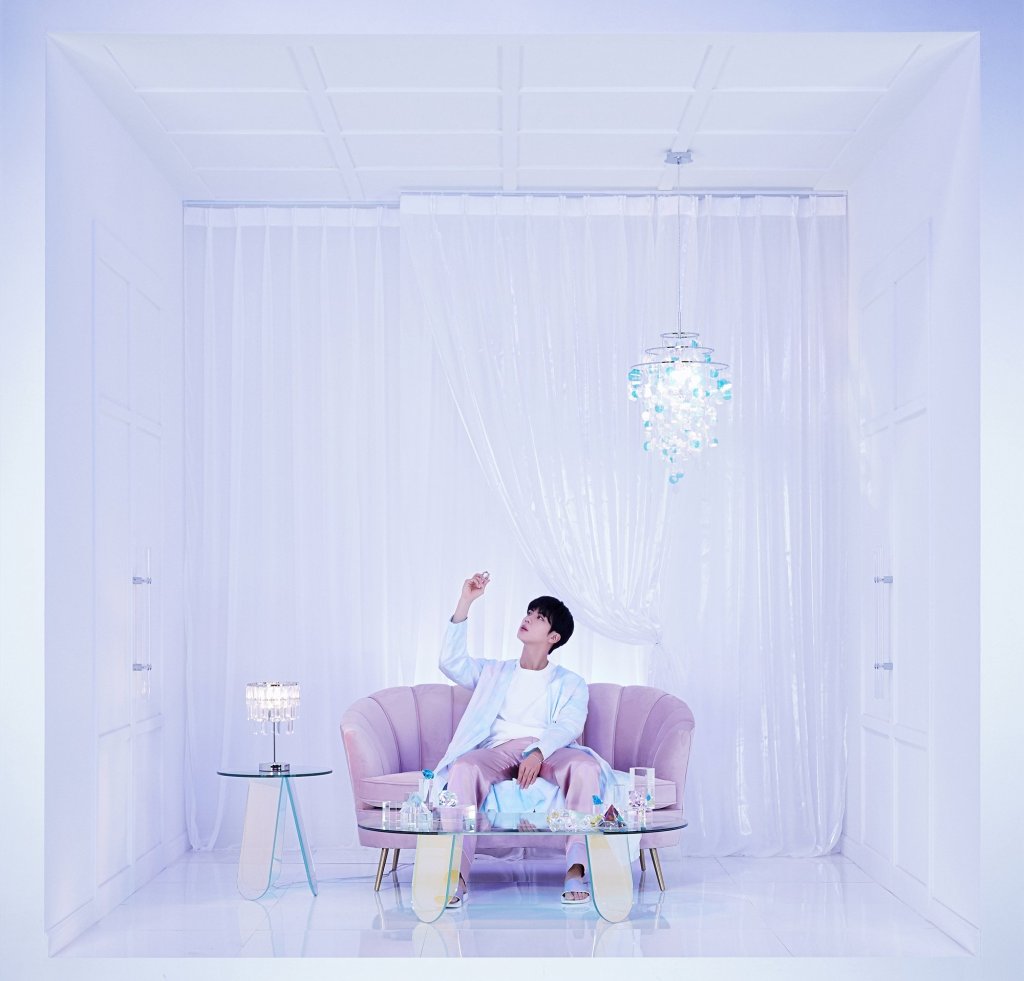 Jin is fifth in line to get his concept photo released. His room is filled with jeweled tones of lavender, blues and white that represent his love for all things simple but elegant. He is sitting on a lavender couch wearing lavender pants and his pastel blue robe matches the blue tones and hues around the room. The color lavender is associated with the youthful, untamed growth found in nature during springtime. Lavender shades have a sacred place in nature, with lavender, orchid, lilac, and violet flowers considered delicate and precious.
