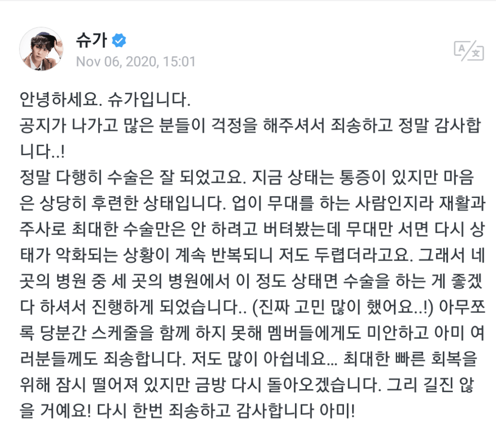 정말 다행히 수술은 잘 되었고요. 지금 상태는 통증이 있지만 마음은 상당히 후련한 상태입니다. 업이 무대를 하는 사람인지라 재활과 주사로 최대한 수술만은 안 하려고 버텨봤는데 무대만 서면 다시 상태가 악화되는 상황이 계속 반복되니 저도 두렵더라고요. 그래서 네 곳의 병원 중 세 곳의 병원에서 이 정도 상태면 수술을 하는 게 좋겠다 하셔서 진행하게 되었습니다.. (진짜 고민 많이 했어요..!) 아무쪼록 당분간 스케줄을 함께 하지 못해 멤버들에게도 미안하고 아미 여러분들께도 죄송합니다. 저도 많이 아쉽네요… 최대한 빠른 회복을 위해 잠시 떨어져 있지만 금방 다시 돌아오겠습니다. 그리 길진 않을 거예요! 다시 한번 죄송하고 감사합니다 아미! _ Suga
