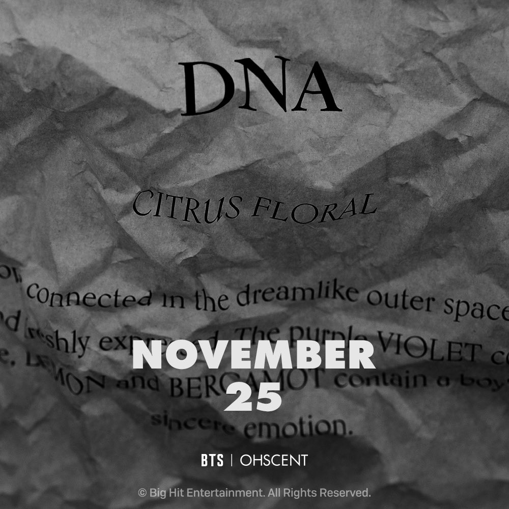 On November 11th 2020, OHSCENT announced on both their Twitter and Instagram pages that will be having a collaboration with BTS. They released a teaser with the captions “BTS MUSIC THEME EDITION coming soon” The poster had the words “DNA Citrus Floral”, which may mean that the fragrance will be called “DNA?”.