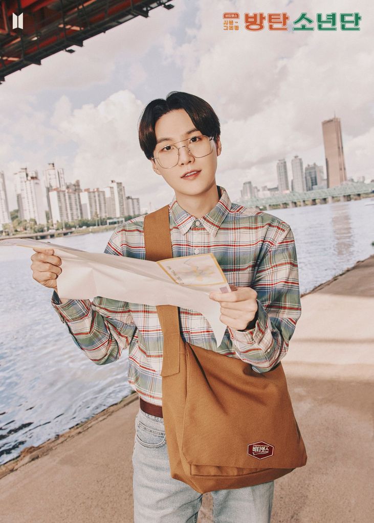 J-Hope wearing quadry checked shirt with matching quadry brown cap