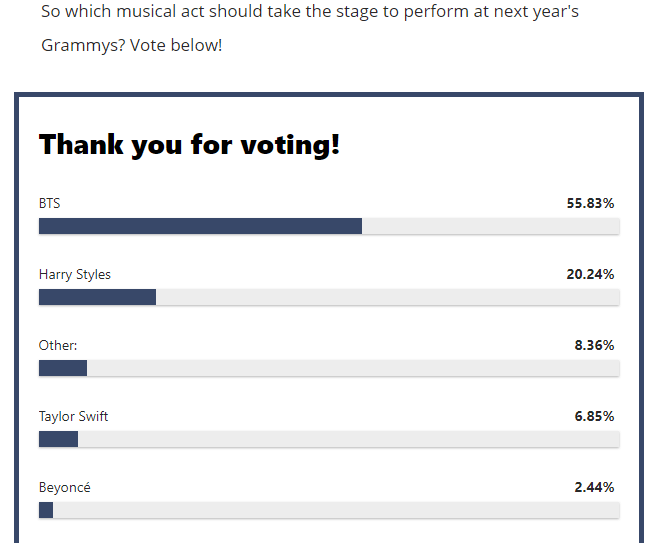 Billboard has put out a poll where fans decide who they would like to perform at the Grammys, and if ARMY is known for anything, it is in supporting their boys in anything and everything that they do. BTS getting their on stage to perform at the GRAMMYs would be a dream come true not only for BTS but for their loyal fans as well. You can VOTE HERE.