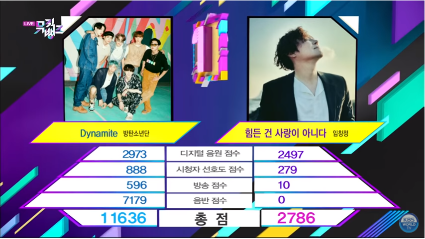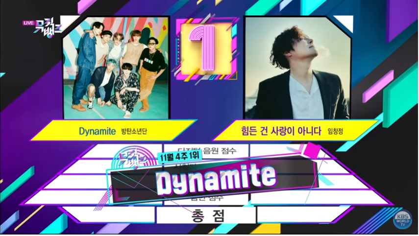 BTS’ hit single “Dynamite” is still at the top of charts, both local and international. This week the upbeat disco pop song earned its 25th Win on the Music Bank Show. Dynamite is on its 4th month since release and it is still gaining popularity despite new releases. On November 27th Music Bank featured BTS’ “Dynamite” vs. Im Chang Jungs’ “Love Should Not Be Harsh On You” as contenders for first place.