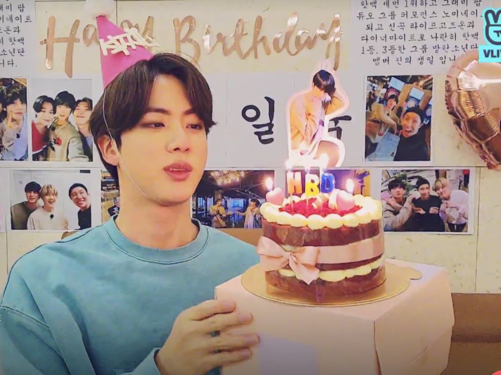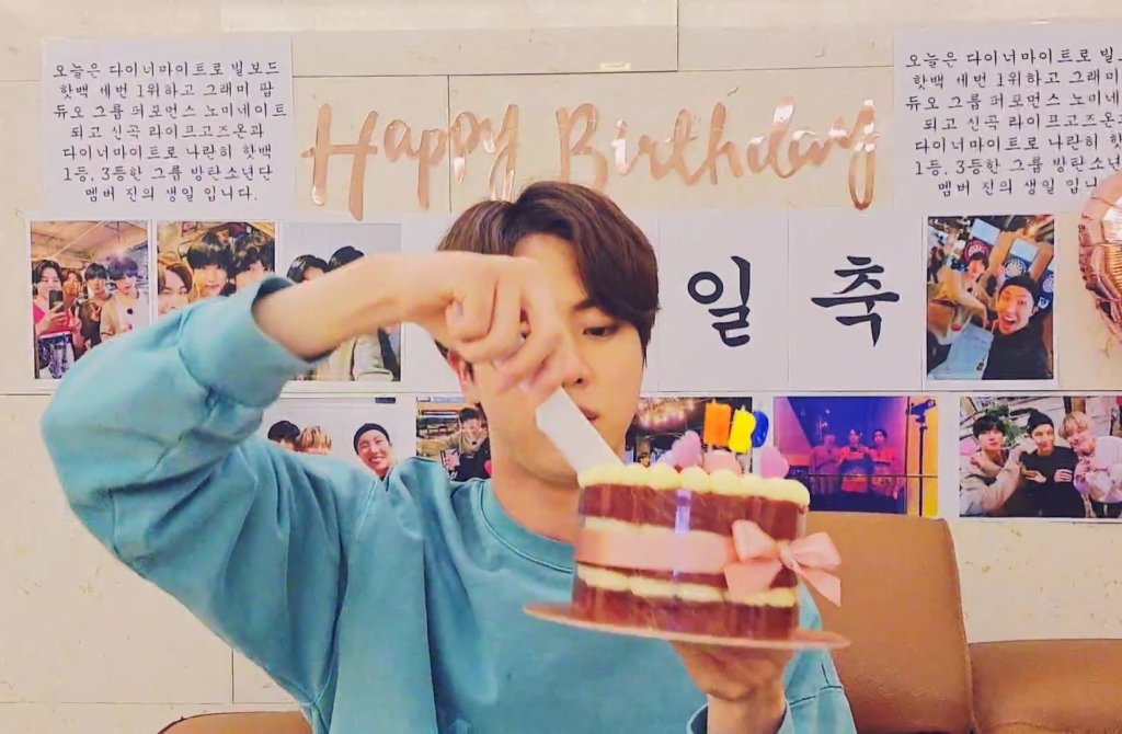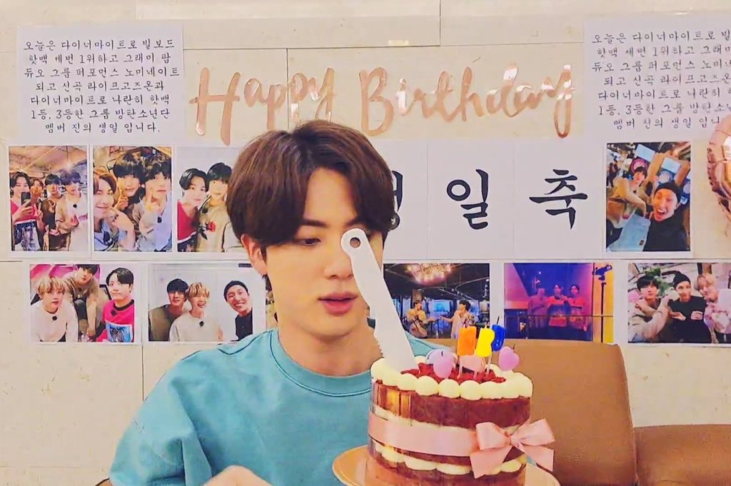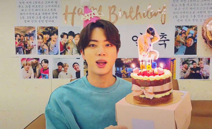 “BTS Jin shared his birthday celebration with Army through a Vlive session where he requested fans to sing for him happy birthday an said that “..the last birthday candle blowing of my 20s. Starting from next year, I’ll be in my 30’s (Korean age) meaning that my life begins anew!” He apologized for being too busy and not preparing for anything. He read out the banner that said “Today is the birthday of the guy who hit no. 1 thrice on Billboard Hot 100 and is nominated for Best Pop Duo/Group Performance at the Grammys, AND hit no. 1 at the same time on Billboard Hot 100 chart with “Life Goes On” and “Dynamite, also known as Jin of BTS!“