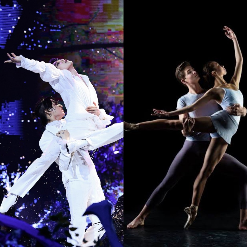 “what more, a usual lift is done in what can be a “fish” like manner, where Jimin is picked up from an arabesque position and folds his bottom leg up, but Jungkook does a presage which keeps Jimin close to his body instead of at arms length”