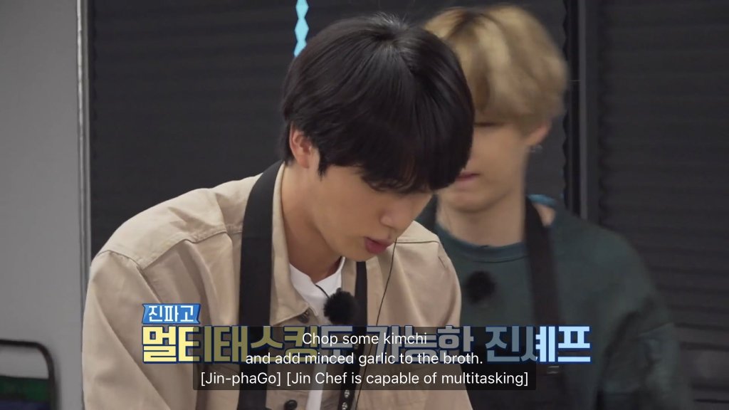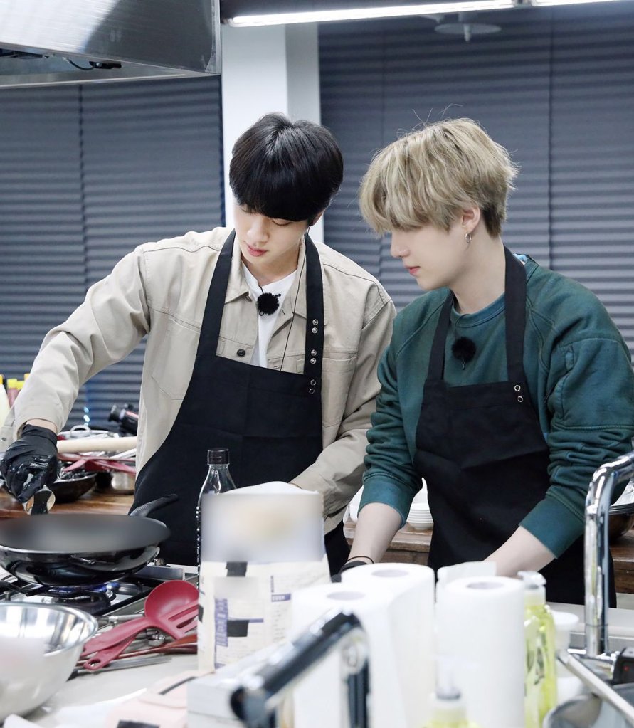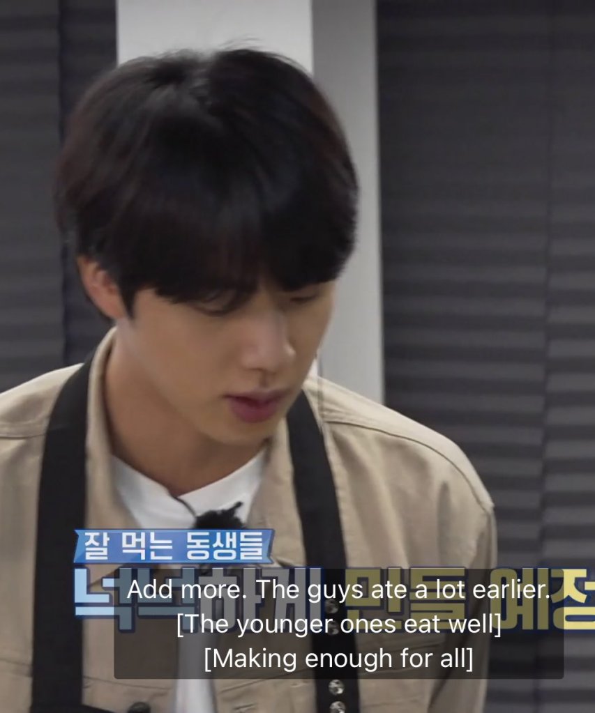 Jin asked Suga to add more ingredients as he remembered that the last time they made the dishes (episode 122), the members really enjoyed the food and ate a lot of the food. Jin also noticed that V enjoyed the food so much that he told him that he would make it for him anytime if he wanted.