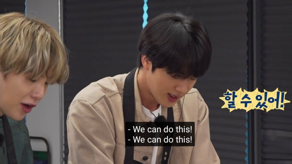 After the dishes were made J-Hope kept saying it’s his fault for doing the side dish first so they didn’t have enough time for the dough and seokjin just said “it’s alright. If we fail, we fail” showing that sometimes all you can do is give if your best no matter what.