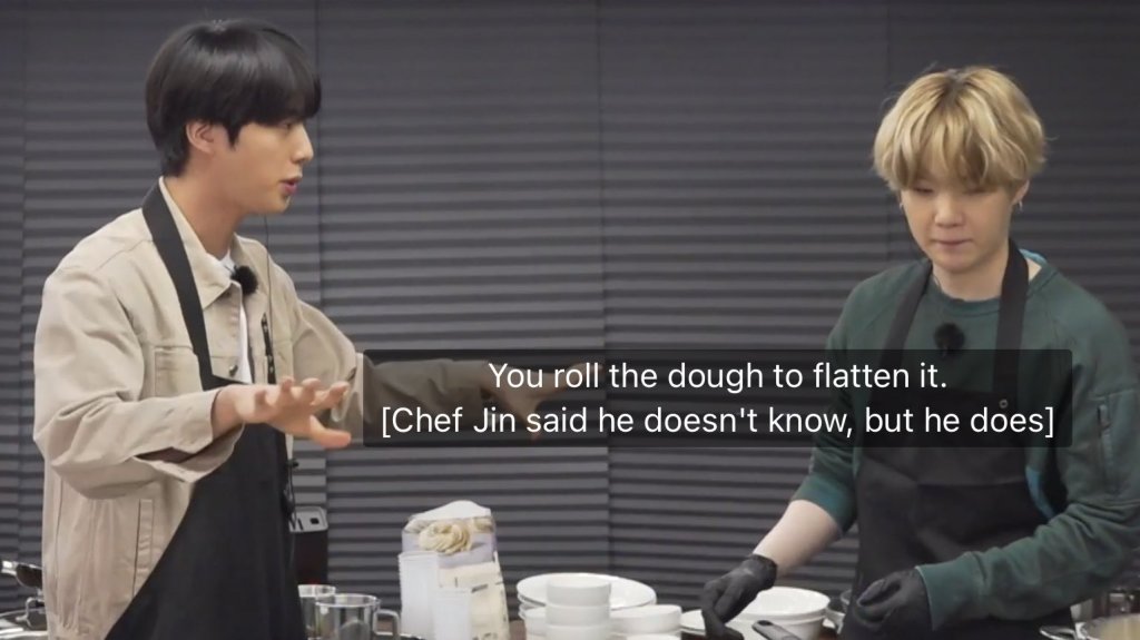 Jin said that he does not know how to cook flour based dishes, Jin does not normally eat wheat, but he explained the techniques for making the dough for the noodles and even took over to solve the issue of the sticky dough…