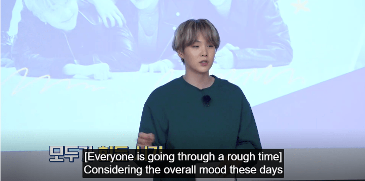 SUGA is a deep thinker and always seems to internalize everything being presented and when he speaks about it, there is usually a tone of wisdom in every sentence. Random fun fact: SUGA writes 200 to 300 sings in a year! that is how his genius mind works. He creates or speaks things with purpose and a point that no one would have thought. Among all the ideas presented, SUGA had the most serious one.