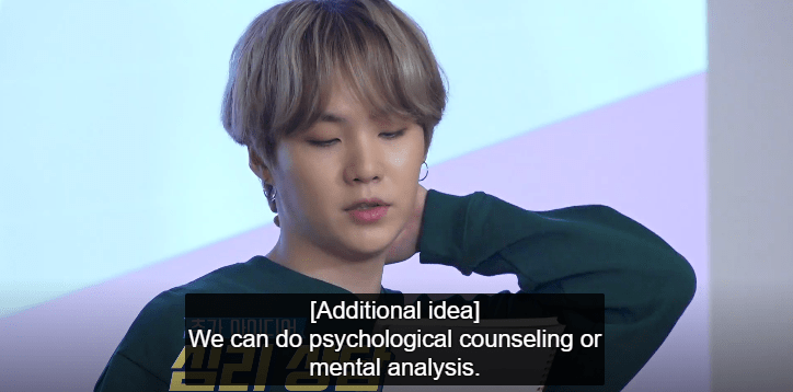 Though SUGA did not elaborate further, his second idea was counselling. He said “We can do psychological counselling or mental analysis”