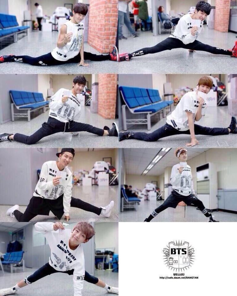 So we can conclude that Jimin, Jin and Jungkook, in that order are the most flexible. Then J-Hope, V, RM and Suga, in that order are the least flexible. Though I know J-Hope as a long term dancer can do the splits, he is also another one with questionable bones, where he dances like liquid! These poses were done when they were just starting so maybe some have moved up the ladder as the years have gone by and they started working out.