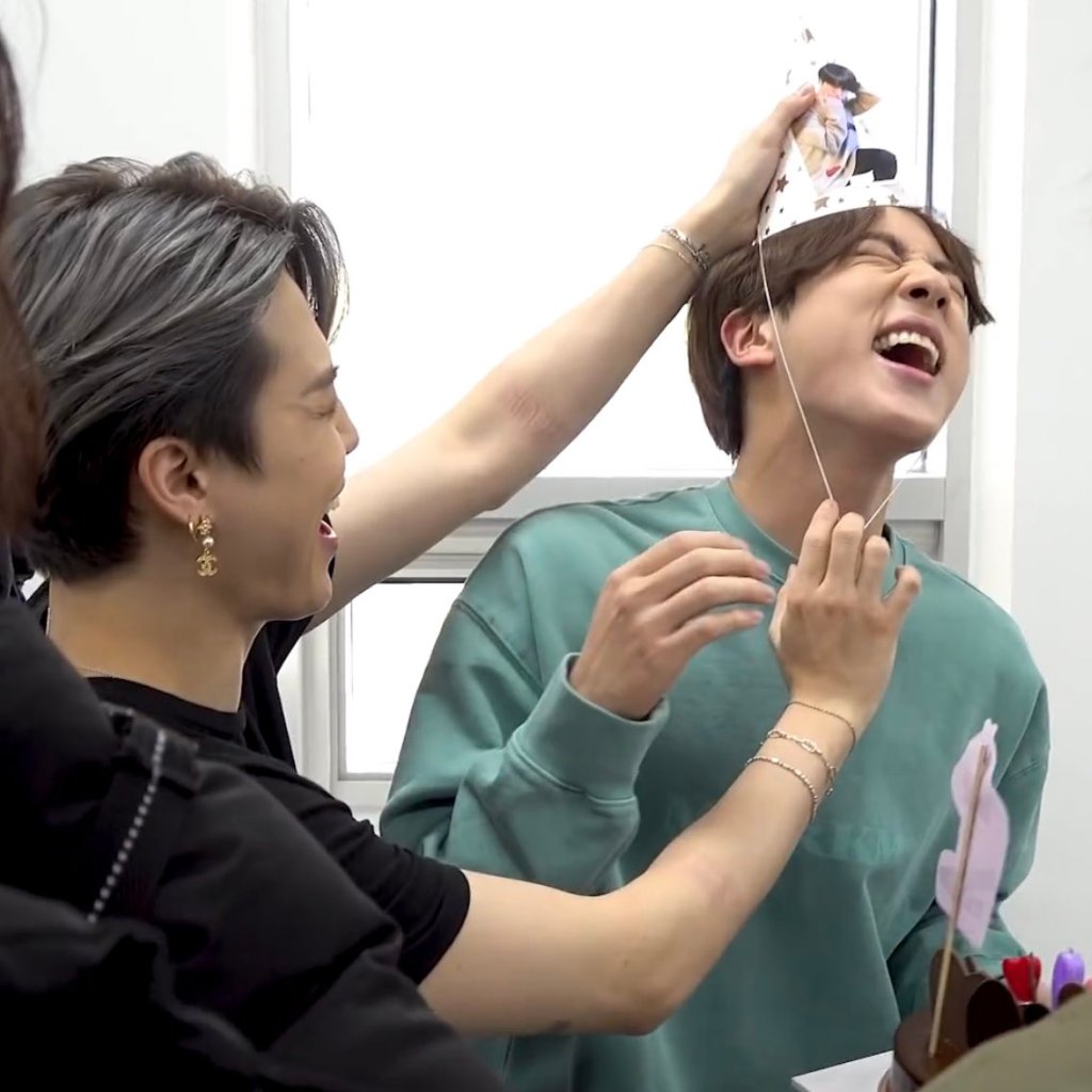 Jimin then flicked the party hat’s rubber band onto Jin’s neck, and Jin feigned hurt as Jimin joked “I barely pulled it” then Kissed Jin’s hands as if to apologize and soothe him. And with that Jimin gave ARMY a soft cute JinMin moment that is still lingering in their hearts. Their reactions are priceless as expected with any affectionate moment that the Bangtan boys have.