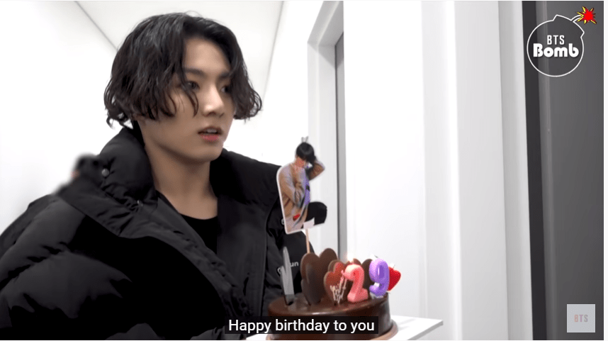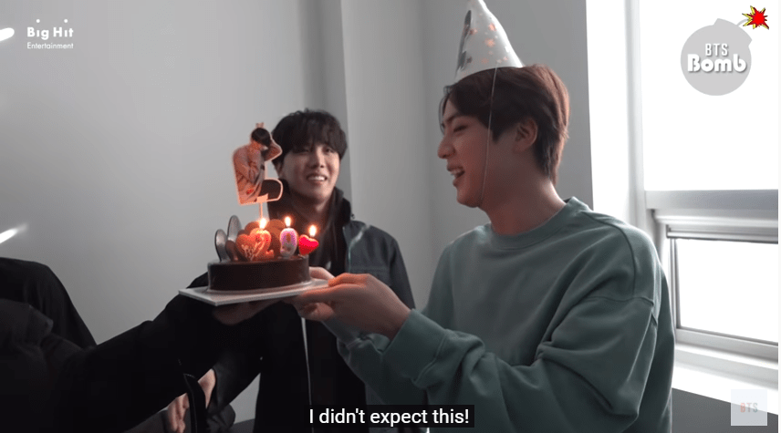 Jin was happy to receive the cake saying that he had not expected it. V, and Jimin squished his cheeks while Rm was rubbing his shoulders saying “So cute”. The others asked him to make a wish then they started singing Jin’s part in their song “Life Goes On”
