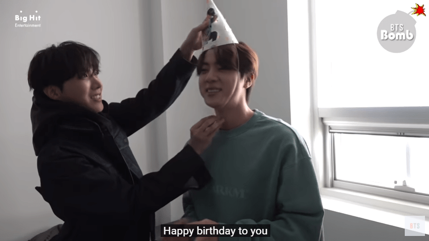 J-Hope put on Jin’s head the birthday party hat as Jimin kept complaining that he couldn’t understand why he kept hiccupping.