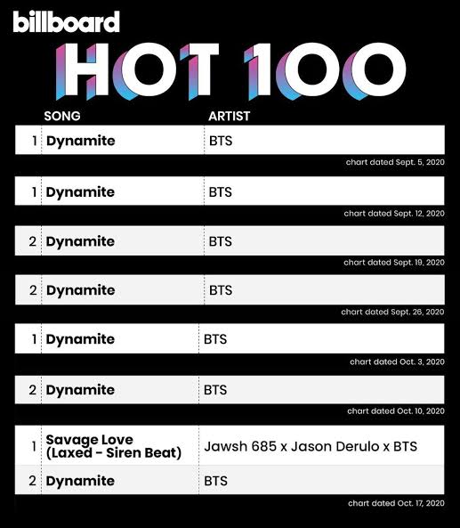 On October 2, BTS released a remix of Jawsh 685 and Jason Derulo’s single “Savage Love (Laxed – Siren Beat)”. It topped the Billboard Hot 100 chart, marking the group’s second number one entry in the United States. Meanwhile, their single “Dynamite” remained at number two, making BTS the fourth group (after The Beatles, Bee Gees, and OutKast) to simultaneously occupy the top two spots on the Hot 100. The single also topped the Billboard Global 200, becoming their second number one entry and making BTS the first artist to have multiple songs top Billboard’s recently created global singles chart.
