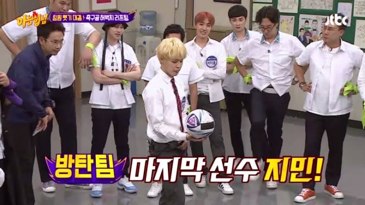 One particularly memorable display of Jimin’s athletic talent came on September 23, 2017, when BTS appeared on the wildly popular Korean variety show “Knowing Bros” (Ask Us Anything). The show is known for its lighthearted chaos, hilarious banter, and physical challenges that often bring out the most competitive sides of the guests. On that episode, the BTS members were asked to participate in a fun, competitive game where they had to bounce a ball on their feet (similar to soccer juggling). The challenge was simple: bounce the ball without letting it drop, and whoever had the highest number of bounces would win.