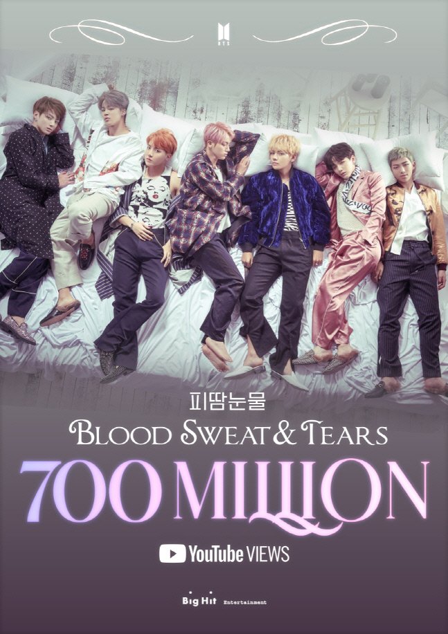 “Blood Sweat & Tears” MV has now surpassed 700 million views on YouTube, becoming BTS’ 7th MV to achieve this! They’re the first group and Korean act to have this many MVs surpass this milestone! Blood Sweat & Tears surpassed 700M views on YouTube. 7 members 7 Music Videos with over 700M views. BTS videos with over 700 million youtube views include “DNA”, “‘Boy With Luv’ (Feat.Halsey),” “FAKE LOVE”, “MIC Drop’ remix,” “IDOL” and “Dynamite”