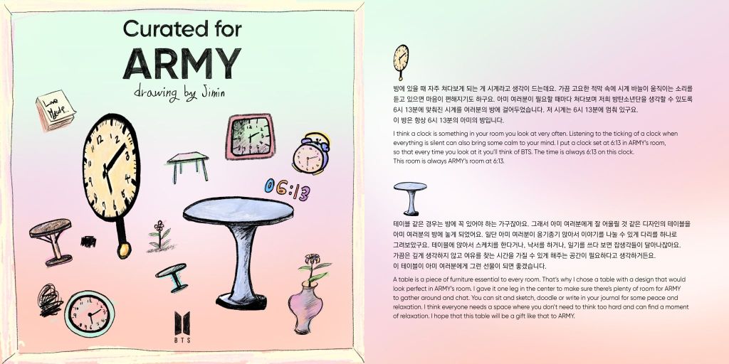 To take this project to an even more personal level, BTS revealed the original sketches they created during the conceptual stages of their curated rooms. These rough, heartfelt drawings showcased their individual creativity and gave fans a peek behind the curtain of their artistic process. What’s so touching about these initial drafts is how freely the members allowed themselves to dream. Every sketch, whether meticulously detailed or charmingly simple, brimmed with sincerity and character.