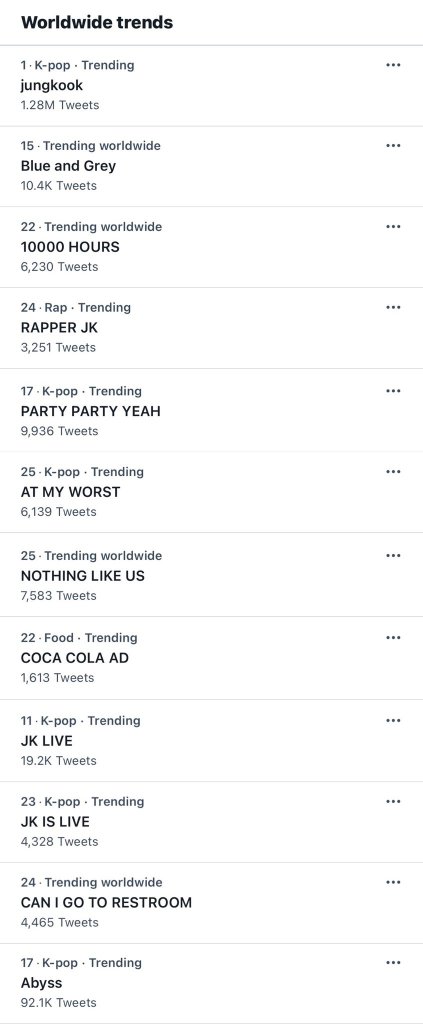 BTS’ Jungkook is currently trending at #1 with over 1.2 million tweets for his name “jungkook” alone, on Twitter as he hosts another VLive. He has 12 other keyword related words trending in several positions on the Twitter sphere. His hair is now a shade of Silver Grey and he looks pretty good. Jungkook’s related Keywords trended under “worldwide,” “k-pop,” “food,” and “rap” categories.