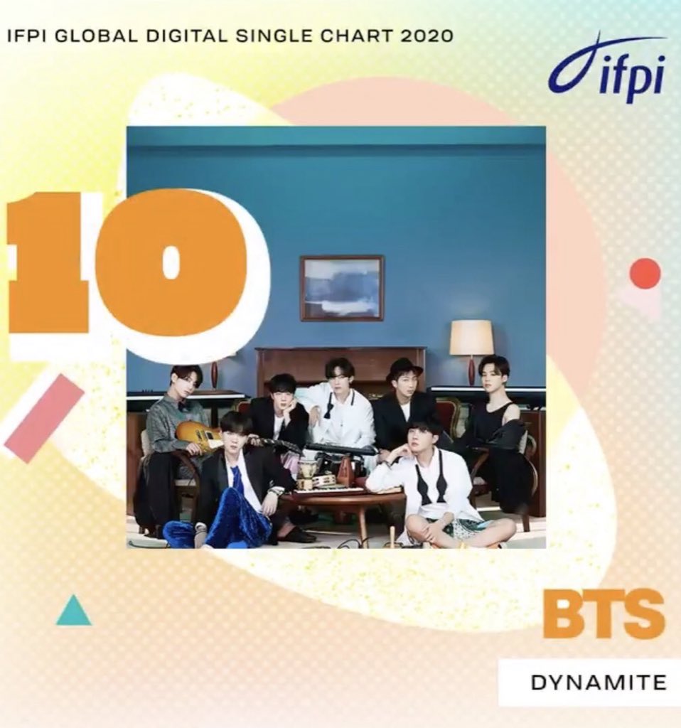 BTS has entered IFPI’s Global Digital Single Chart for the first time ever this year with “Dynamite”! This is the first time a Korean group makes the list & the first for a Korean act after ‘Gangnam Style’ in 2012. “Dynamite” is the youngest song in the Top 10 having been released only on 21st August 2020. The IFPI’s Best Selling Global Singles of 2020 are #1 Blinding Lights, #2 Dance Monkey, #3 The Box, #4 Roses, #5 Don’t Start Now, #6 Life Is Good, #7 Made to Love, #8 ROCKSTAR, #9 bad guy and #10 Dynamite.