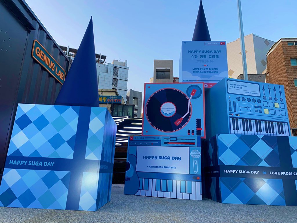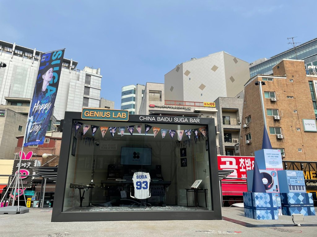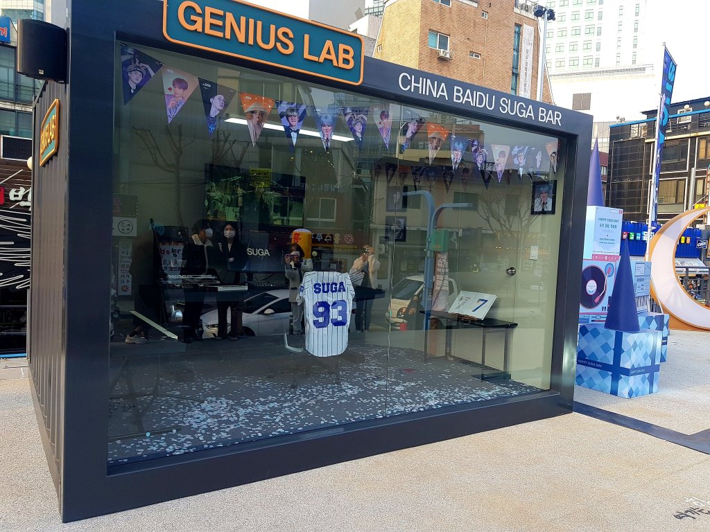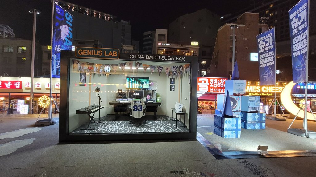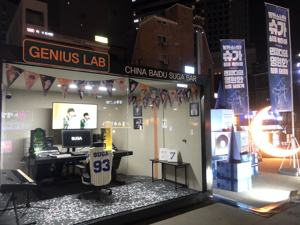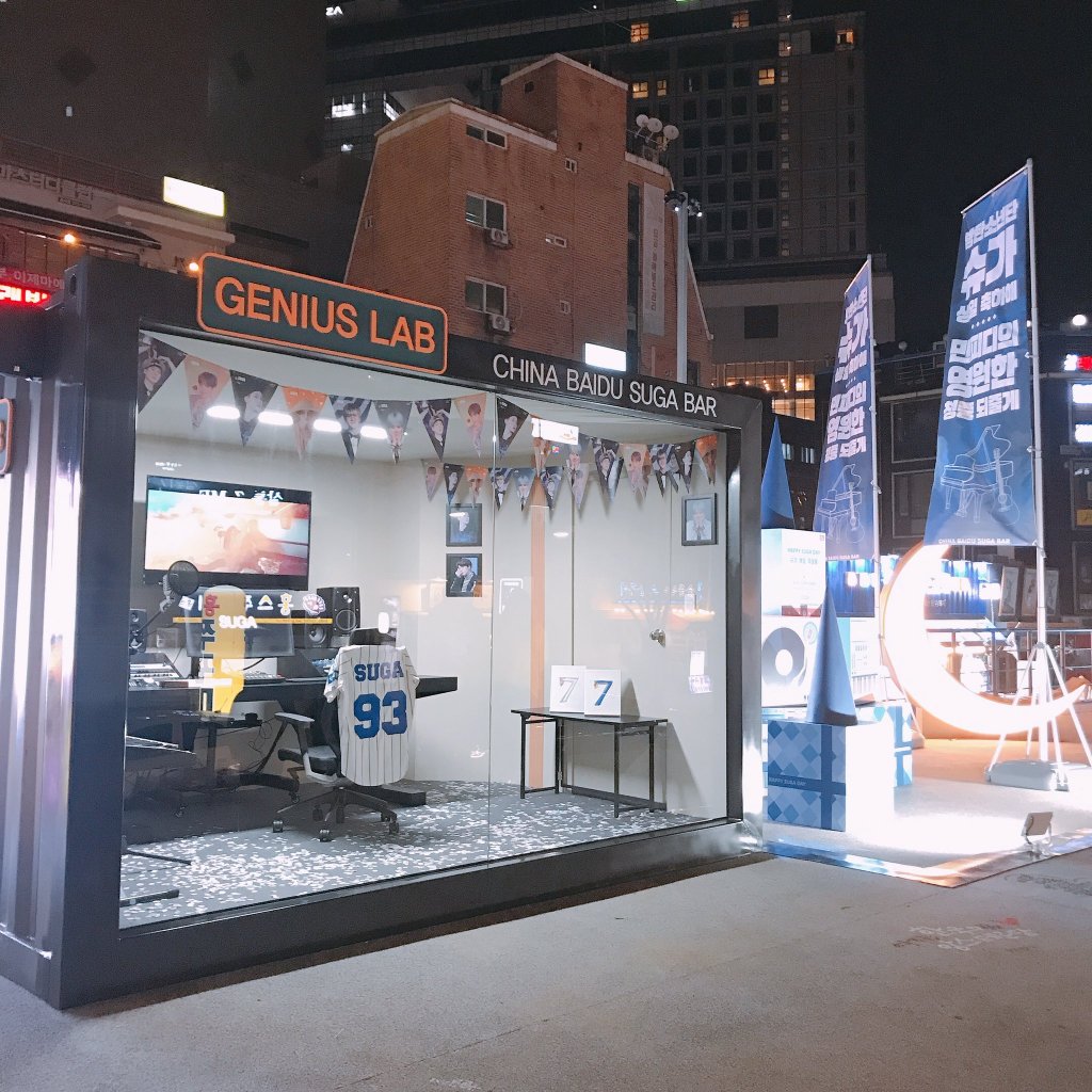 BTS Suga’s large Chinese fan base, China Baidu Suga Bar, set out a project to create Korea’s largest outdoor birthday exhibition in 2021 for their rapper, Suga. The exhibition was a perfect replica of Suga’s studio named “GENIUS LAB” and erected at Hongdae main street. The structure was made with all the details that you would find in a studio like a TV, speakers, even the legendary Suga’s jersey laid on a chair.