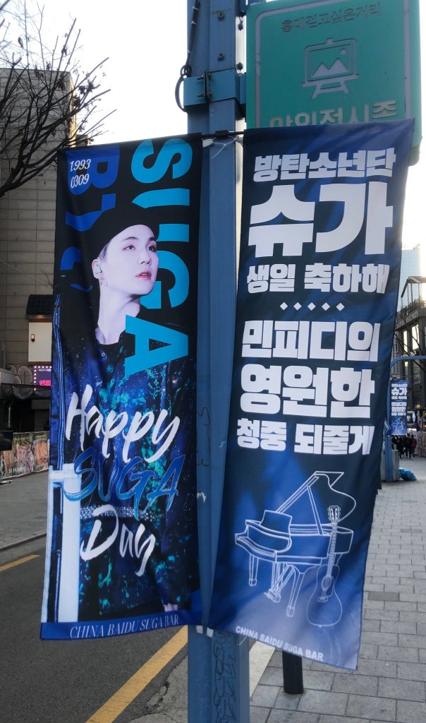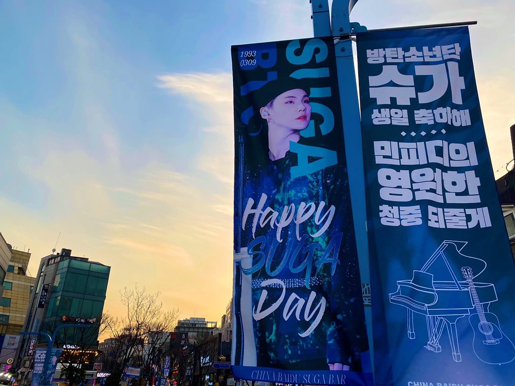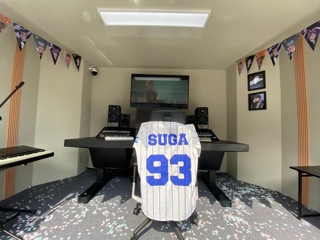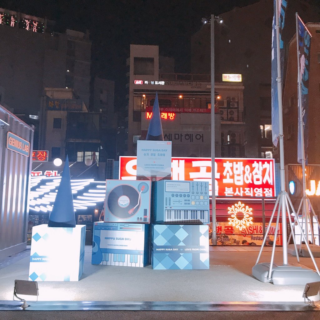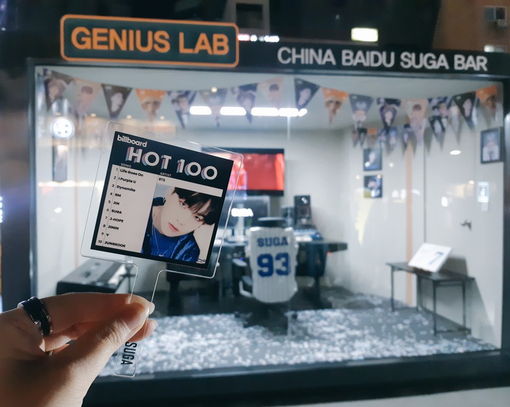 BTS Suga’s large Chinese fan base, China Baidu Suga Bar, set out a project to create Korea’s largest outdoor birthday exhibition in 2021 for their rapper, Suga. The exhibition was a perfect replica of Suga’s studio named “GENIUS LAB” and erected at Hongdae main street. The structure was made with all the details that you would find in a studio like a TV, speakers, even the legendary Suga’s jersey laid on a chair.