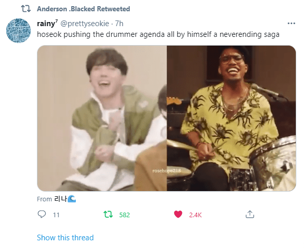 BTS fans (ARMY) always have fun threads of actions or words that the members use or say and they are always comparing the members to super heroes, cartoons, anime characters and even other celebrities. One such tweet was about J-Hope being given the opportunity to be a drummer since he always seems to be doing the drumming actions whenever he gets the chance. Which is not unexpected because J-Hope is never seated whenever they have interviews, he is either dancing, recreating characters or imitating characters, his dancer body does not allow him to be still!