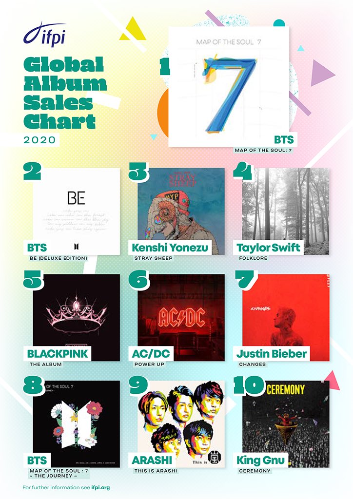 BTS the 1ST artist to appear on all 4 IFPI charts, they are the first group in history to have three albums in IFPI’s Top 10 best-selling albums worldwide in pure sales. BTS is the only act to appear in every single IFPI Year-End List of 2020 (artists, singles, albums units, albums pure). BTS (2020) and Michael Jackson (2009) are the only artists in history to rank three albums inside the top 10 of IFPI’s Year-End list in the same calendar year (pure sales).