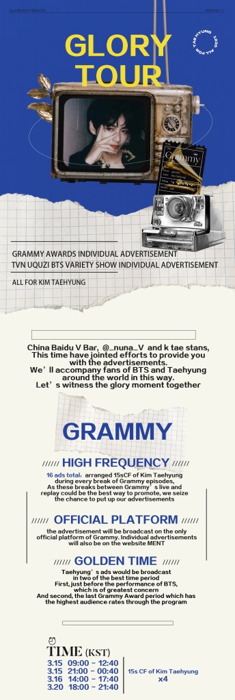 BTS V’s largest fanbases, China Baidu V Bar, @_nuna_V and k tae stans have joined efforts to provide individual advertisements for V during the Grammy awards. BTS’s V will have a total of 16 ads run every 15 seconds during every break Of Grammy episodes. Individual advertisements will also be on the website. The ads will be broadcast in two of the best time periods, first just before the performance of BTS, and second, the last Grammy Award period which has the highest audience rates through the program, the fan base announced on their Twitter handle.