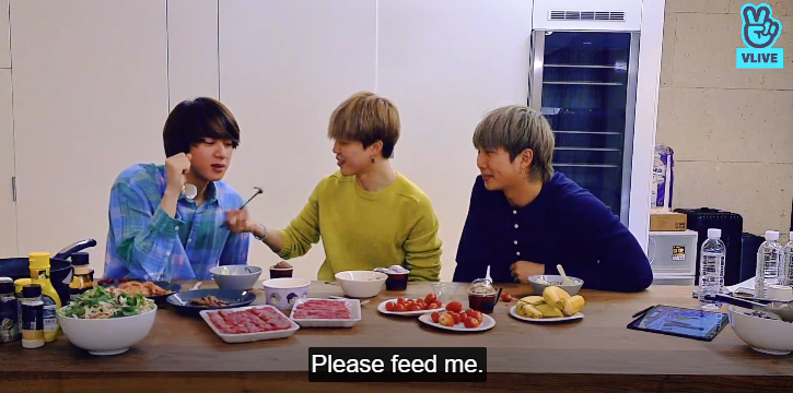 Jimin: “The other day, Jungkook said he would go on a diet. And he (V) asked him to feed him at a meat restaurant. V is… he’s a devil. You know like this, feed me”
