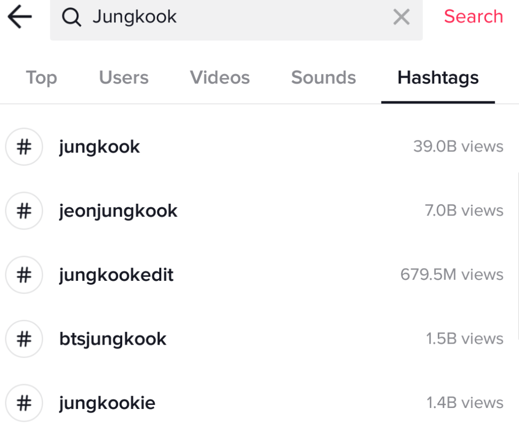 the top 5 terms are, his name “jungkook” has 39.0 Billion views, “jeonjungkook” has 7.0 Billion views, “btsjungkook” with 1.5 Billion views, “jungkookie” with 1.4 billion views and “jungkookedit” with 679.5 Million views, over 10 search terms related to his name have billions and millions of views o Tick Tock