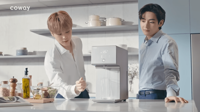 Coway has collaborated with BTS for a mattress ad campaign. Today BTS’ Jimin and V appear in Coway’s new Water Purifier Ad campaign. The water purifier has several specifications that make it a great addition to your home. The purifier’s “compact design gives you more space! Less noise for quieter kitchen!” Other specifications include UV fauset care, smart diagnostics, voice support, sleep mode, custom extraction, continuous extraction, hot water locking and Increased space utilization.
