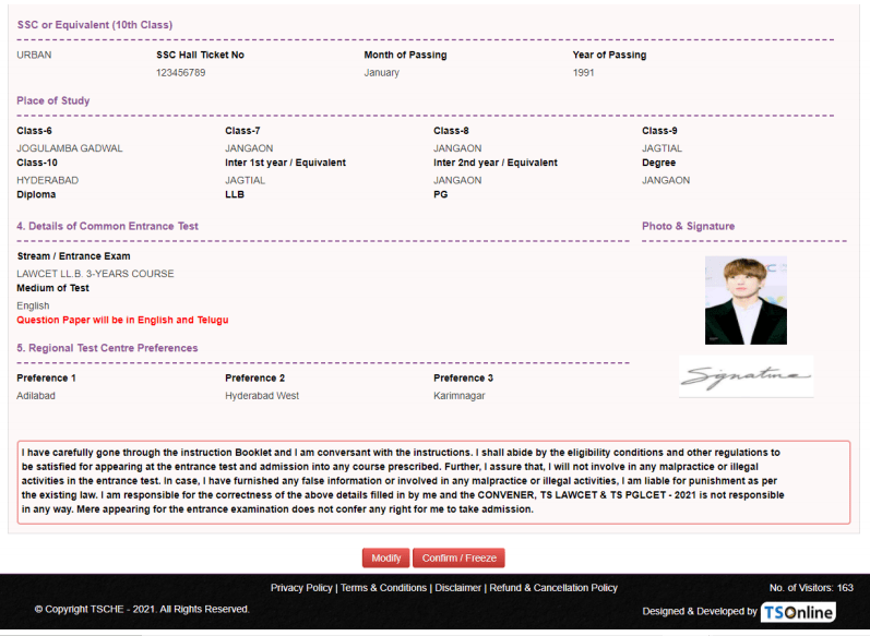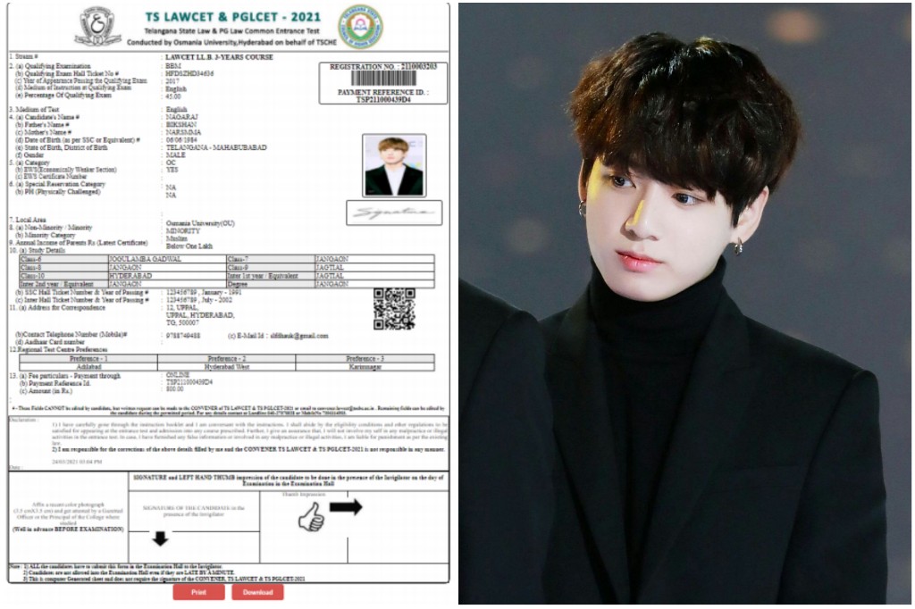 A profile picture of Jungkook was captured in the online user’s guide for completing the online application form for the Telangana State Law & PG Law Common Entrance Test for the Indian University.