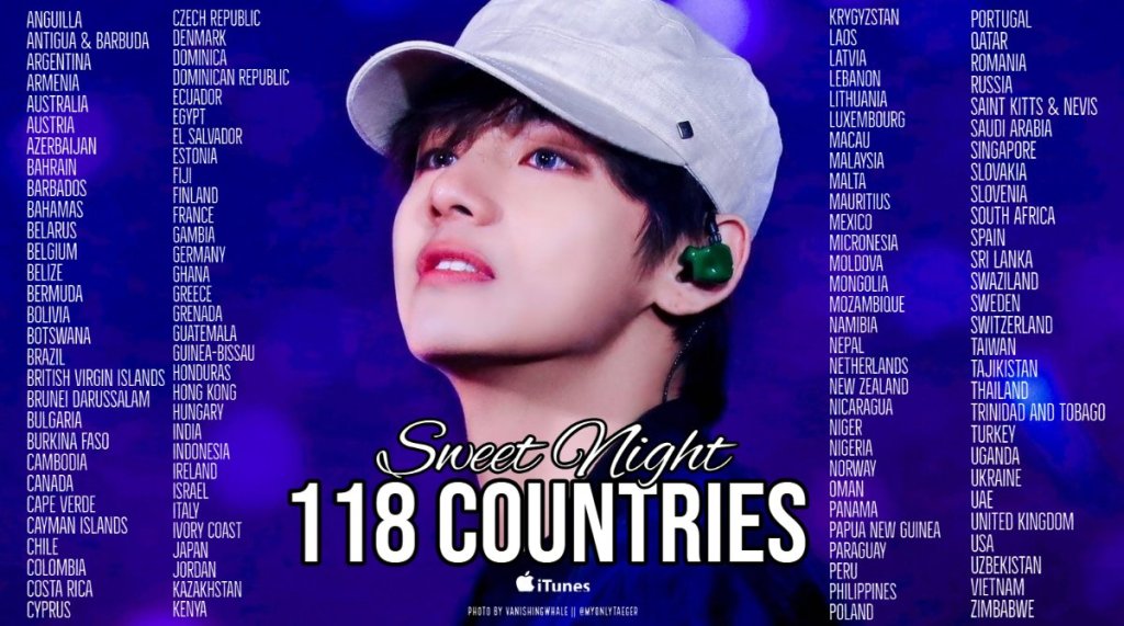 “Sweet Night has achieved 118 #1s Worldwide on iTunes singles charts- extending its record as the only song in the world to achieve this milestone and making Taehyung the only artist in the world to achieve this for a single! His other solos Inner Child has #1 in 95 countries, Stigma has #1 in 46 countries while Singularity has #1 in 45 countries.