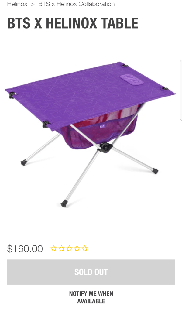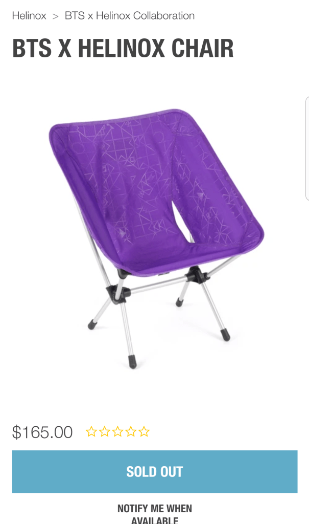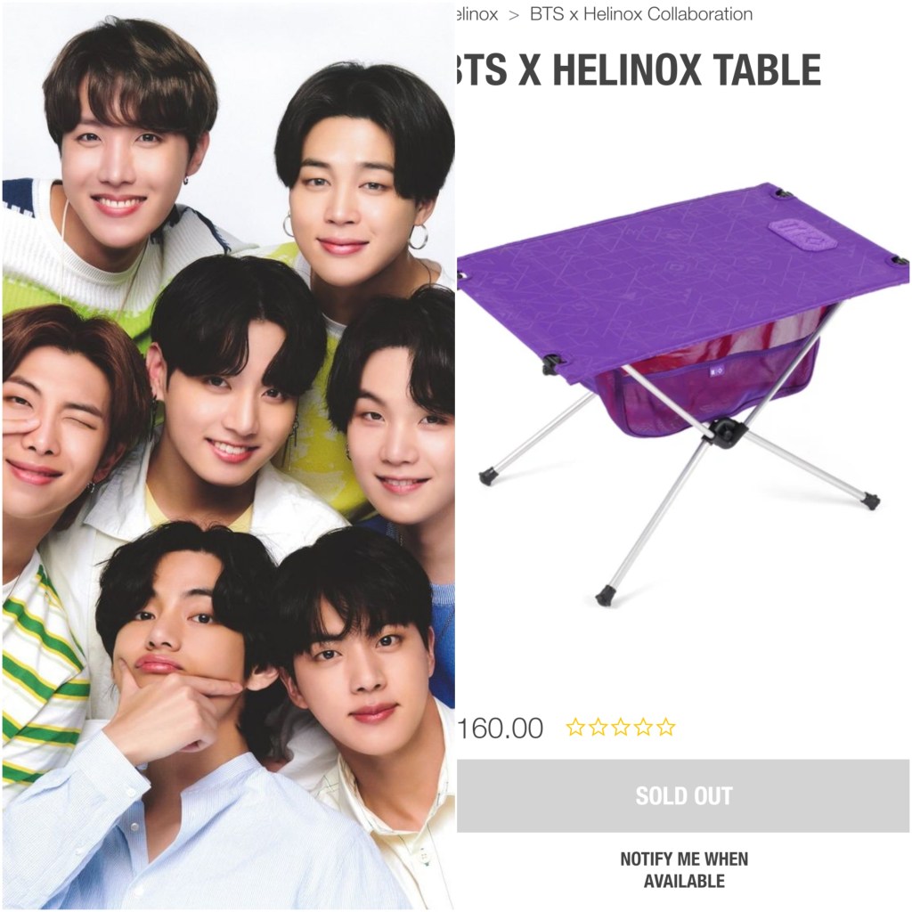 “Hellinox” announced that it will launch the BTS x Helinox collection on April 7th 2021. Through this collaboration, a total of six products were released that includes chair, table, coat, sakoche, gym sacks, and Velcro patch (Helinox Chair One, a Cot One convertible with a mesh net tray underneath, a Table One Hard Top, Sacoche bag, Gymsack, and a patch reading “Hello My Name is”) all in line with BTS’ purple theme that has become a globally recognized symbol as BTS’ color that identifies their relationship with their fans, the ARMY.