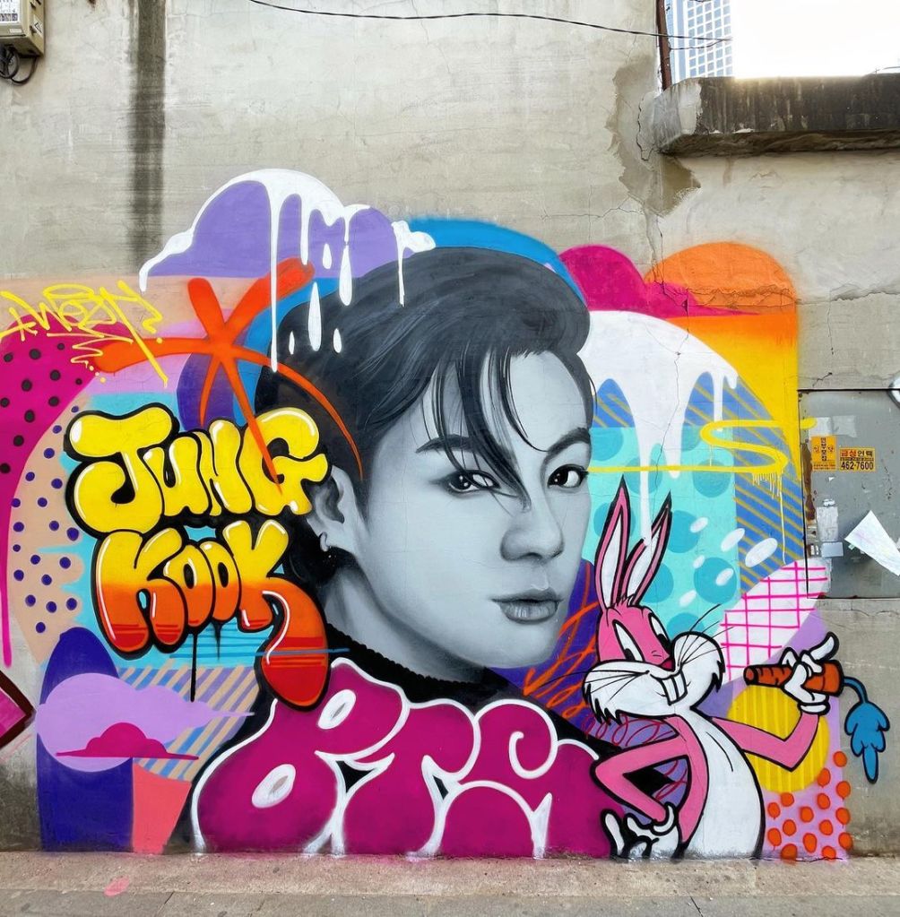 “This is BTS Jungkook’s graffiti that took about 10 hours in 3 days. I painted in an alley in Seongsu-dong, a hot place in Seoul. I worked on drawing the image of Jungkook’s pictorial on the wall. I drew backgrounds using various colors. We will show you more wonderful works in the future. Thank you. Graffiti requests are received via Instagram or KakaoTalk mail. Jungkook Graffiti Address: 5 Wangsimni-ro 6-gil, Seoul”
