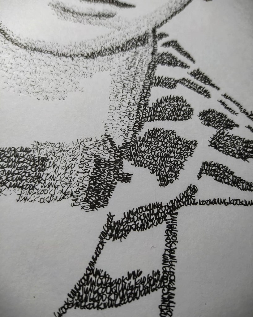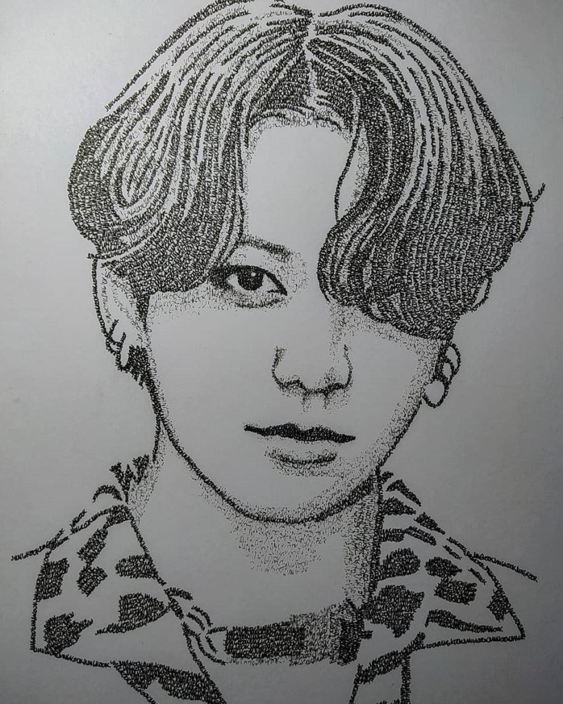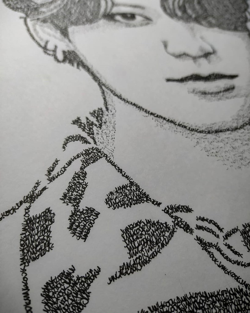 It is truly an Incredible work of art as the process requires patience, a lot, a lot of patience. Judging by the intricate details, the dedication is truly admirable! He is sketching Jungkook just by using his name as the lines to use in the drawing!