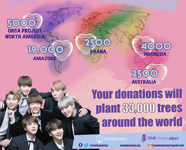 For the 2019/2020 birthday season, “One In An ARMY” ran #WePurpleEarth; a special BTS birthday project designed to create a better tomorrow on our planet earth. Along with the regular birthday campaigns, each member’s birthday was accompanied by a 48-hour flash donation period benefiting One Tree Planted. One Tree Planted is a non-profit organization that plants trees around the world. Every dollar raised pays to plant one tree. BTS ARMY team raised enough to plant 33,000 trees, so far they have already planted over 14,000