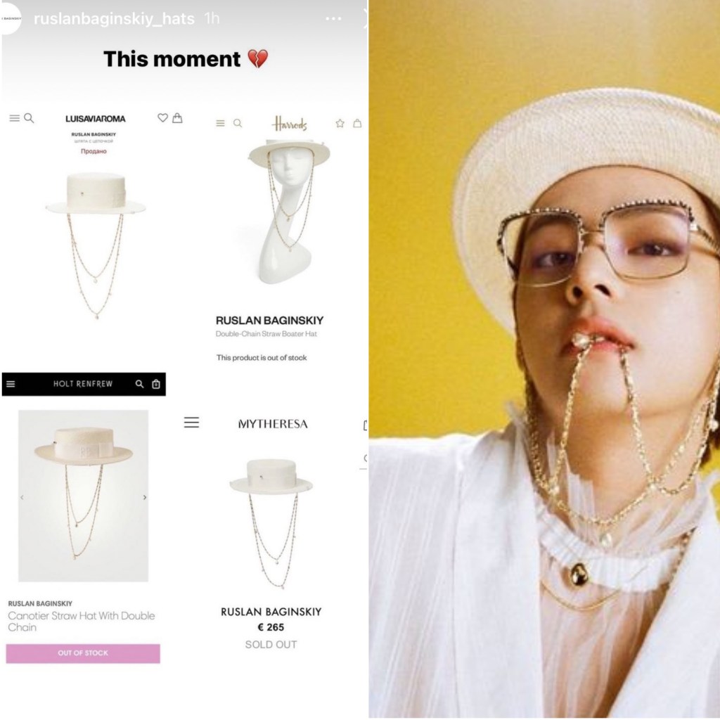Ukrainian Brand Ruslan Baginskiy posted a story on their Official Instagram showing how BTS V managed to sell out a $340 Straw Boater Hat on all of their Websites within 30 hours! They even have a photo of V on their account wearing the hat that he showcased on his photo for thier “Butter” Teaser photo.