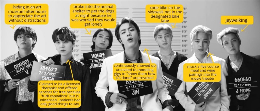 In the end, these “crimes” are really just a reflection of the unique personalities and charm of each of the BTS members. From riding bikes on the sidewalk to sneaking five-course meals into the theater, the crimes are quirky, fun, and filled with love. And while these “offenses” might be ridiculous, one thing’s for sure BTS continues to break boundaries, set trends, and spread joy in everything they do. ARMY, of course, will always be there to laugh, support, and celebrate their favorite group, no matter what crimes they commit.