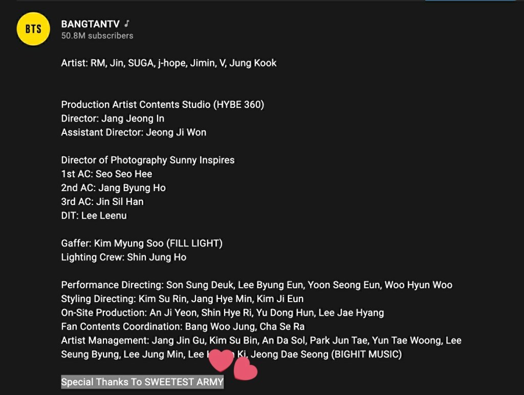 The phrase “Special thanks to SWEETEST ARMY” is more than just a simple thank-you. It encapsulates the special place ARMY holds in BTS’s hearts. The use of the word “sweetest” is especially meaningful, as it reflects the tenderness and warmth of the connection that BTS shares with their fans. ARMY has been with them through thick and thin, through moments of struggle, growth, and triumph, and the love they’ve received in return is a testament to how much BTS values their supporters.