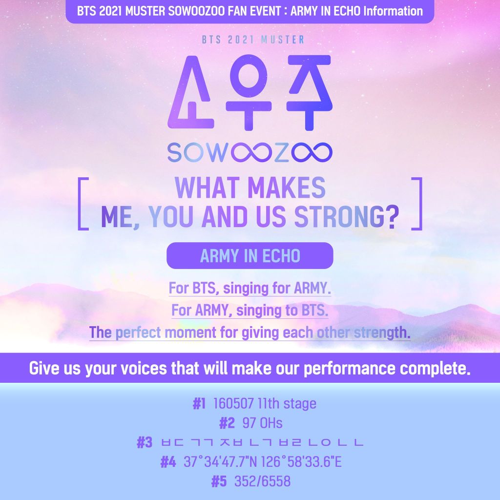 “We would like to provide information on BTS 2021 MUSTER SOWOOZOO FAN EVENT : ARMY IN ECHO. Please check the signals above for the five songs that need ARMY to echo in with. (You may submit for all five songs) Please record the entire song from start to finish as singing en-masse or using the official fan chant. To ensure that your voice is heard clearly, please listen to the music using earphones and record only your voice.”
